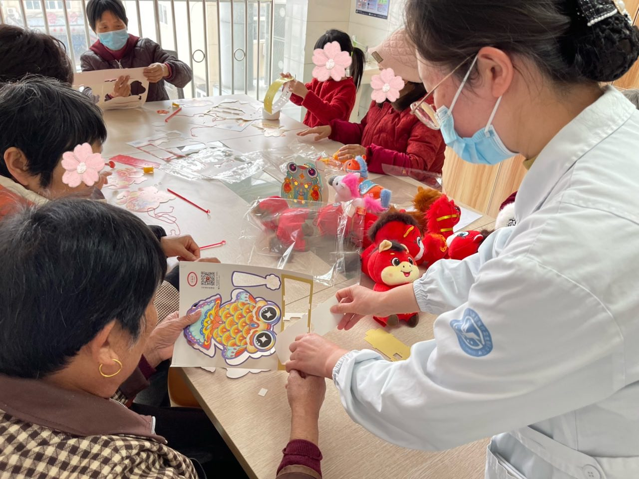 活动现场早已被布置得喜气洋洋,五颜六色的彩纸、丝带、胶水等制作材料整齐摆放,医护人员们化身“指导老师”,耐心等候着老人们的到来。当老人们陆续来到活动区域,看到满桌的材料,脸上都露出了期待的笑容。